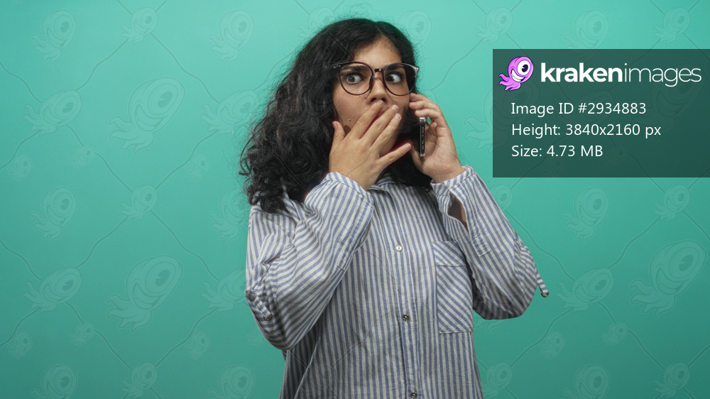 Young arab brunette woman wearing glasses and striped shirt holds smartphone to ear with hand over mouth in teal studio; surprise urgent call.