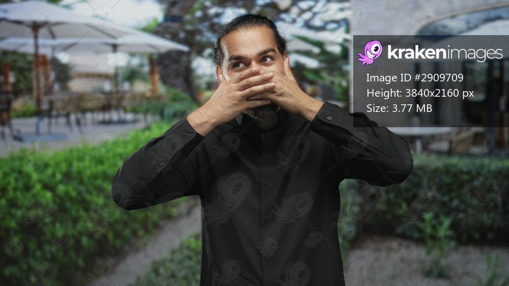Young arab hispanic man covers mouth with both hands on a restaurant terrace of a building outdoors in a black shirt; surprise secrecy playfulness.