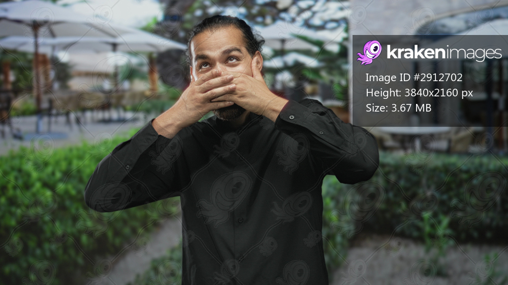Young arab hispanic man covers mouth with both hands on a restaurant terrace of a building outdoors in a black shirt; surprise secrecy playfulness.