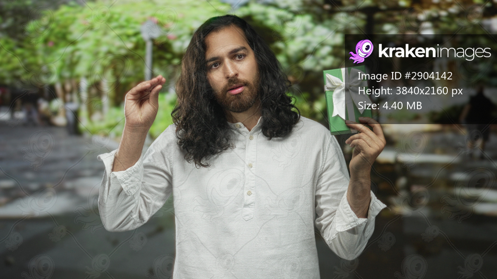 Young arab hispanic man holding green gift box with white bow in right hand while gesturing with left palm up on street; curiosity.