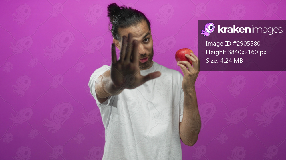 Young arab hispanic man with man bun holding red apple while showing palm forward stop gesture in pink studio; playful pause.