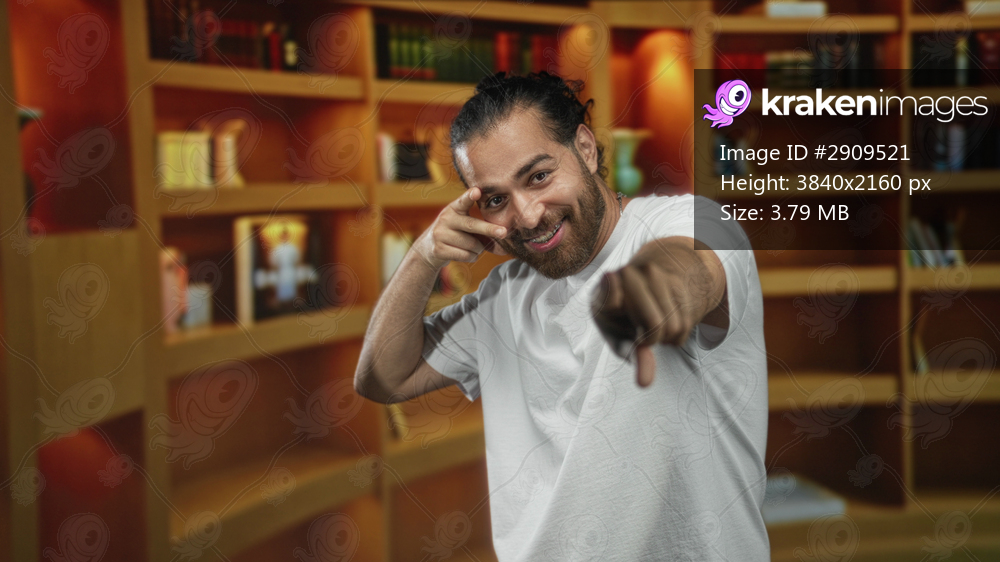 Young arab hispanic man points finger to camera while smiling, wearing white tshirt in library with books and wooden shelves; playful confidence.