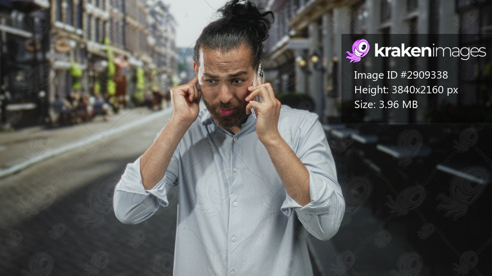 Young arab hispanic man pressing finger into ear while holding smartphone to his ear on a busy european city street lined with cafes and shopfronts; frustration urgency. - Kraken Images