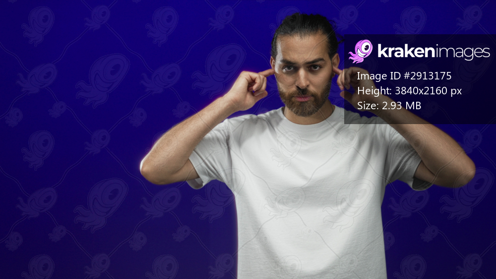 Young arab hispanic man pressing fingers into ears in studio against a deep blue backdrop wearing a white t shirt, eyes closed in discomfort; irritation noise sensitivity. - Kraken Images