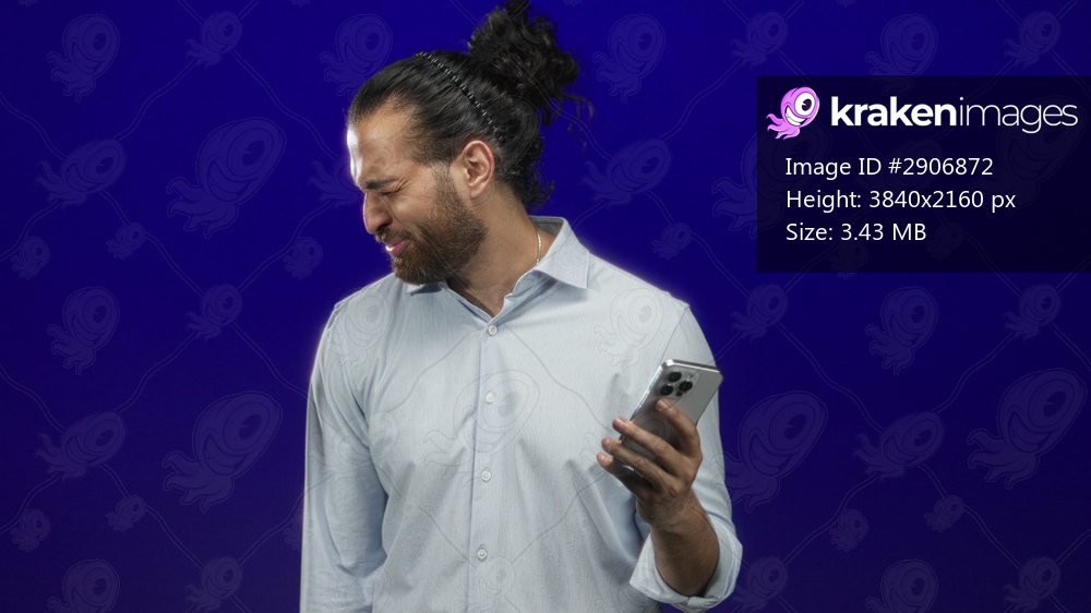 Young arab hispanic man squinting and grimacing at smartphone in blue studio setting; frustration technology problem mobile.