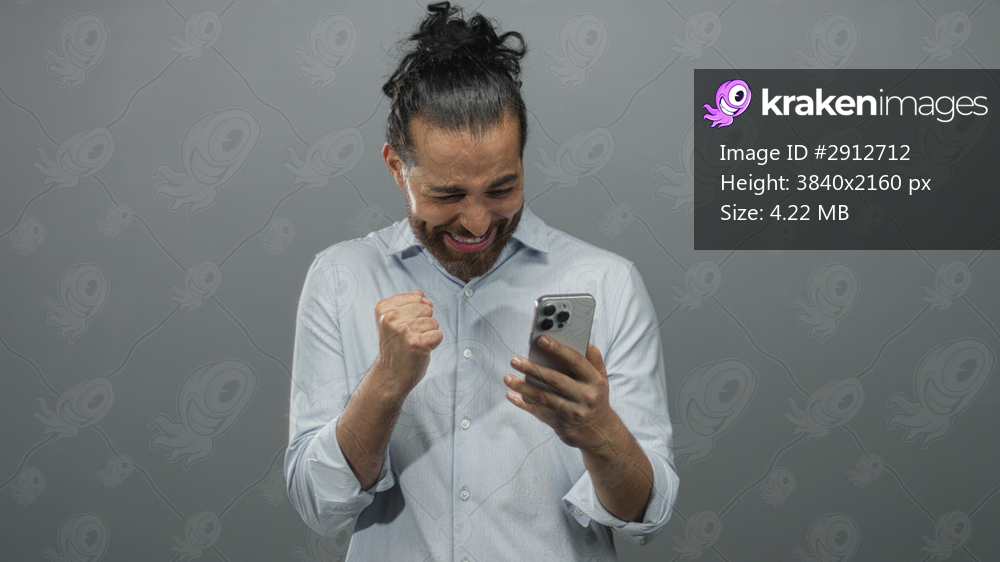 Young arab hispanic man tapping smartphone with both hands, smiling and looking down in a medium gray studio; delight connection.