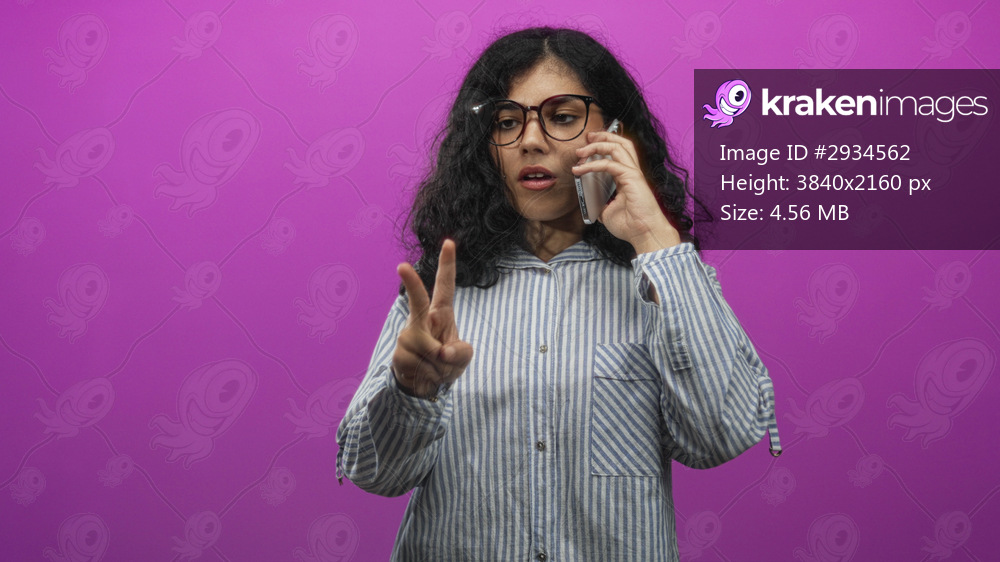 Young arab woman brunette holding smartphone to ear and pointing finger in studio with vibrant purple backdrop; concentration communication.