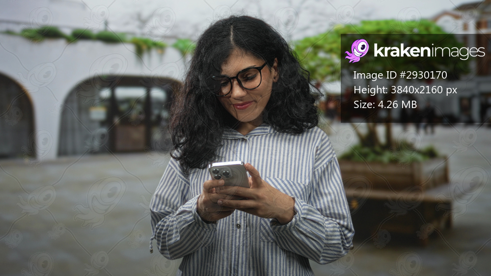 Young arab woman with curly brunette hair and glasses holding a smartphone with both hands while smiling in front of a building on street; contentment. - Kraken Images