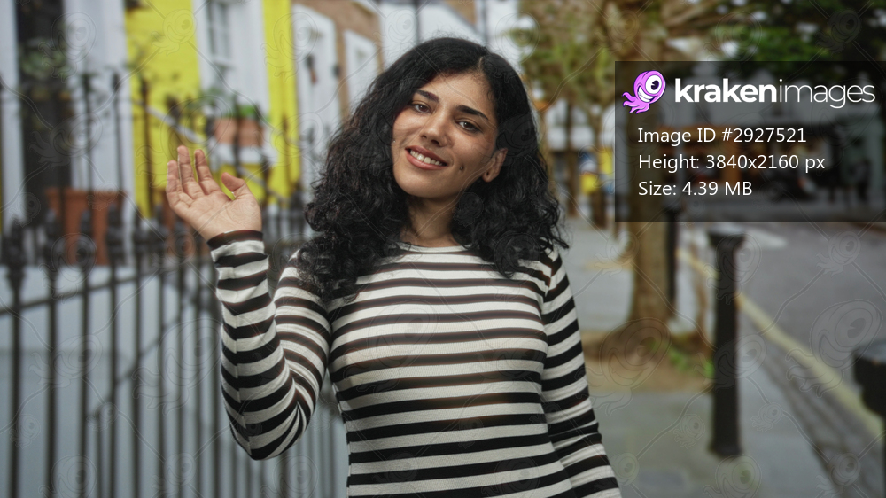 Young arab woman with curly dark hair waving right hand on city street near iron railing and tree while smiling; friendly greeting.