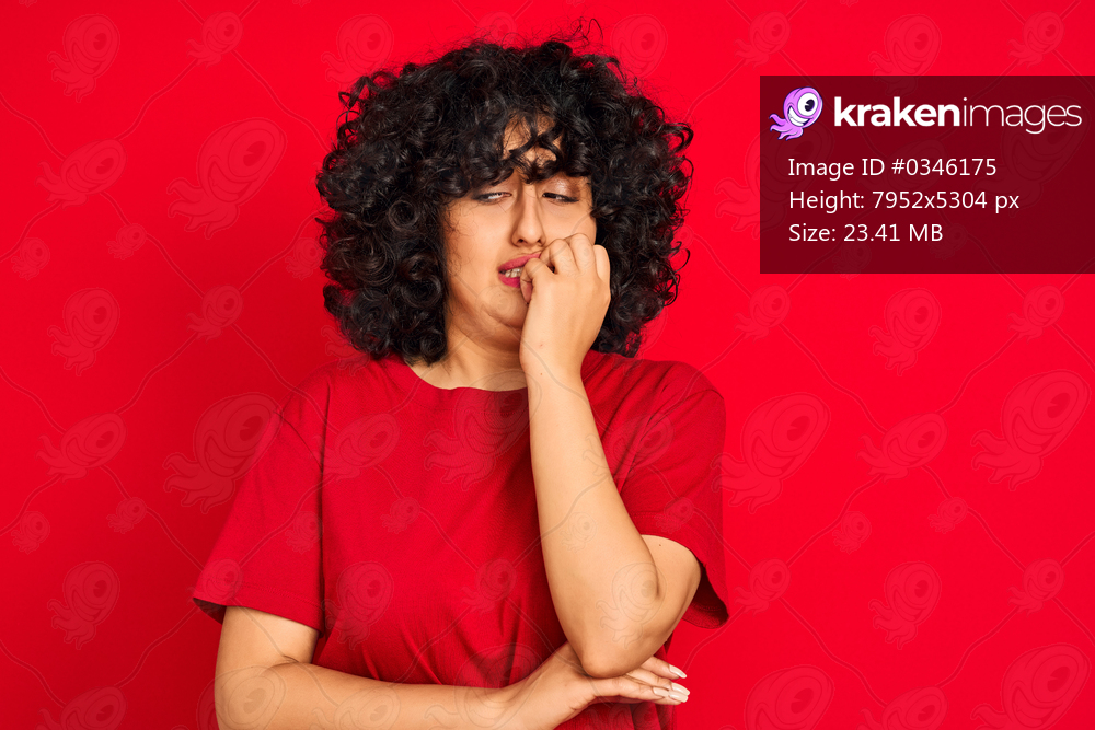 Young arab woman with curly hair wearing casual t-shirt over isolated red background looking stressed and nervous with hands on mouth biting nails. Anxiety problem. - Kraken Images