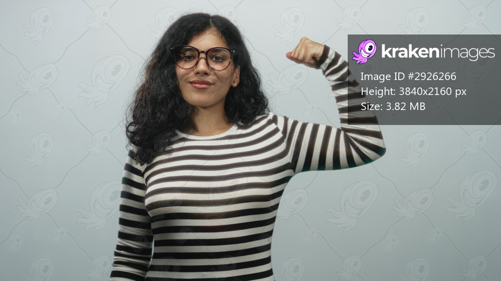 Young arab woman flexes arm and shows fist in studio with a pale blue backdrop, wearing striped shirt and glasses; confidence empowerment.