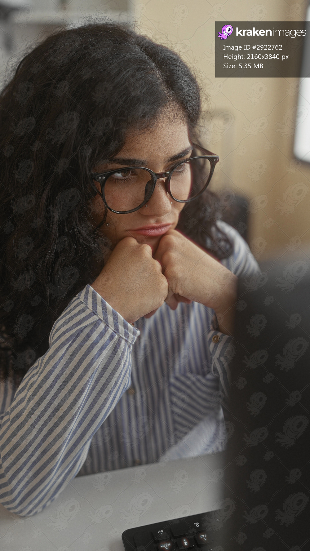 Young arab woman with glasses and cheek piercings, fists under chin at a building desk, staring at a computer screen in an office; boredom.