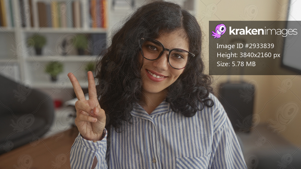 Young arab woman with glasses smiles and shows peace sign with right hand in office building interior near bookshelf and suitcase; happiness positivity. - Kraken Images