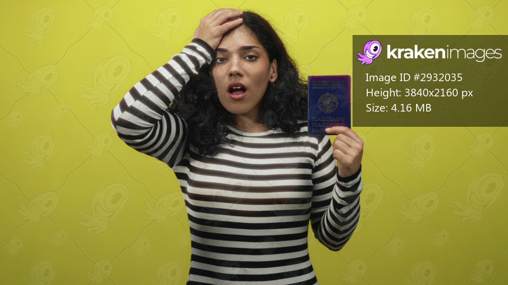 Young arab woman holding a passport and pressing hand to forehead in studio yellow backdrop; travel surprise.