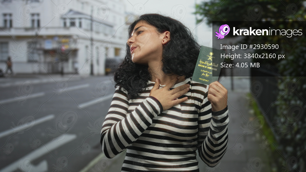 Young arab woman holding a saudi passport on a city street with hand on chest; pride identity immigration.