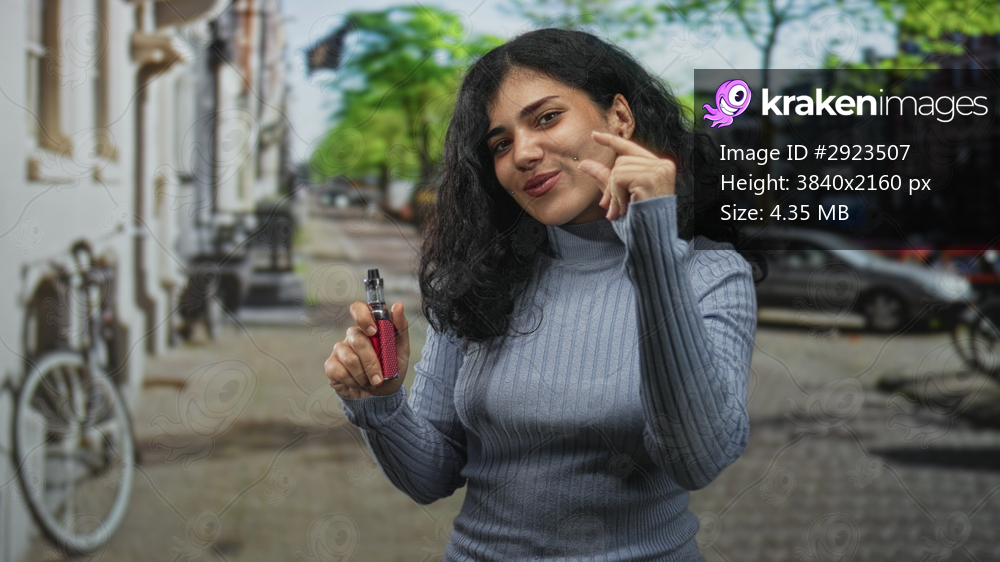 Young arab woman holding a vape and pinching fingers on a city street near bicycles and parked cars; relaxation city leisure.