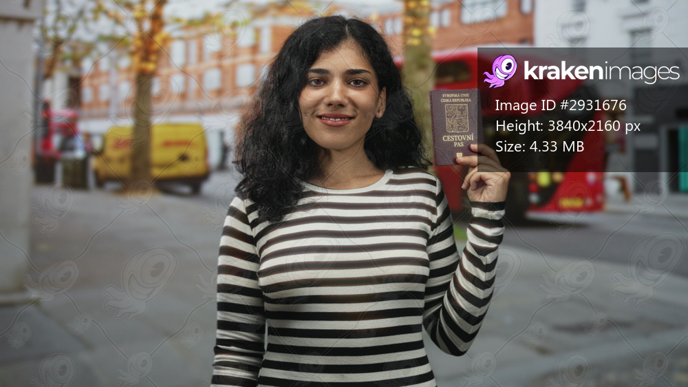 Young arab woman holding czech passport up with one hand on a city street by shops and buses; travel pride.