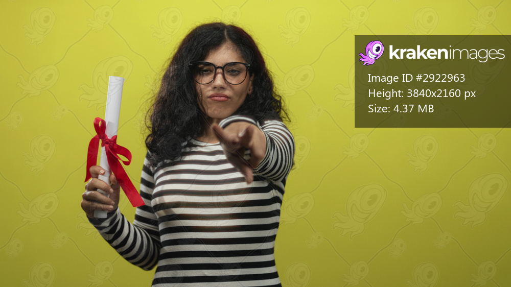 Young arab woman holding diploma with red ribbon and pointing finger in yellow studio; pride celebration.
