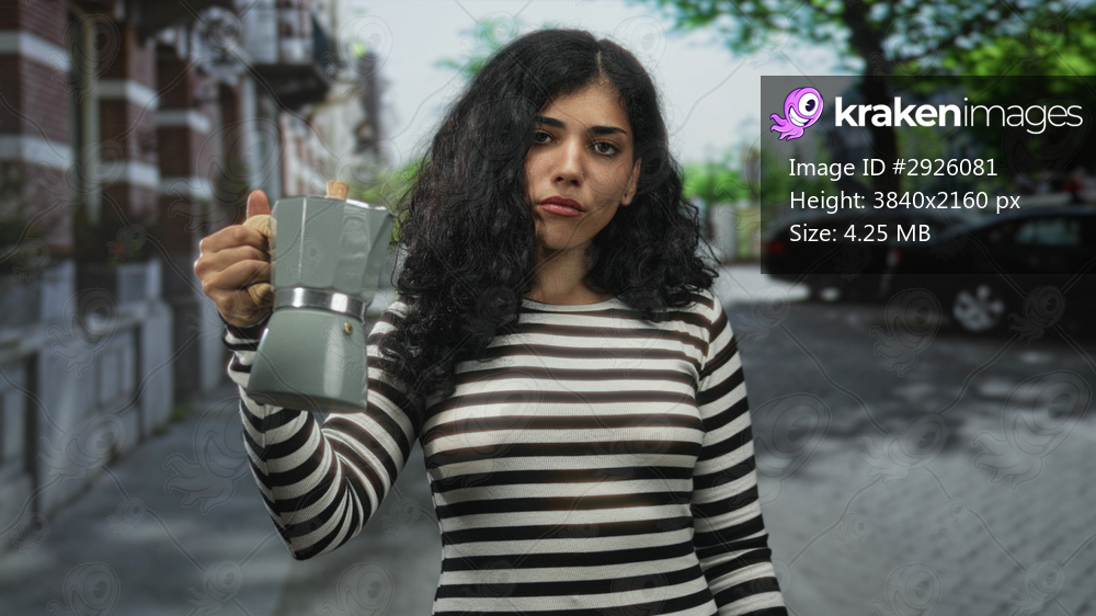 Young arab woman holding moka pot in outstretched bare hand on a cobbled street by brick building, striped top visible; quiet contemplation.