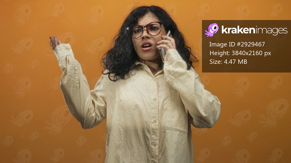 Young arab woman holding phone to ear with glasses and loose beige shirt in studio against orange wall; frustration confusion.