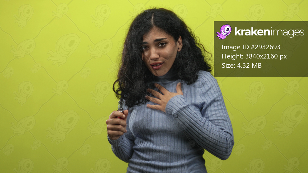 Young arab woman holding vape with hand on chest in studio against lime green wall; surprise vulnerability.