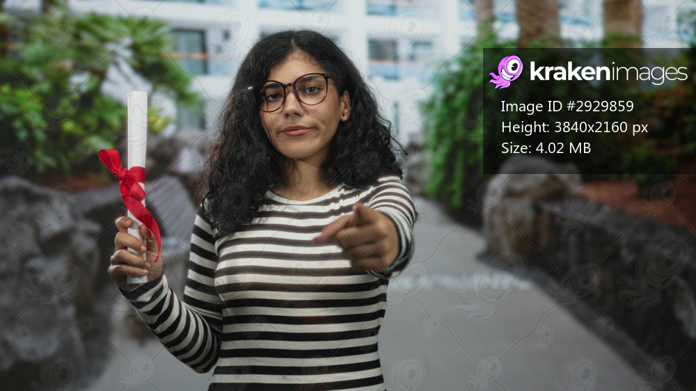 Young arab woman holds diploma with red ribbon and points finger to camera in building corridor; achievement pride.