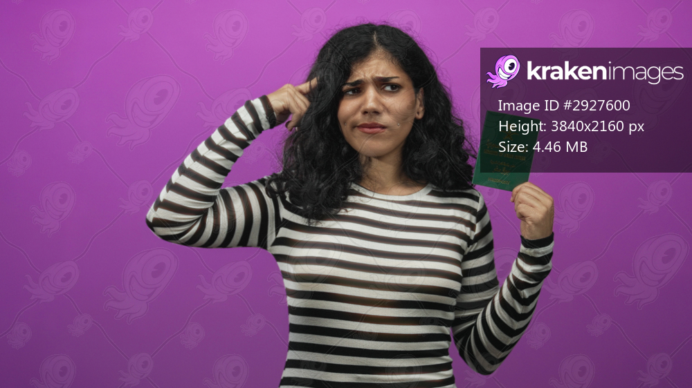 Young arab woman holds saudi passport and points finger to head in purple studio; confusion travel uncertainty.