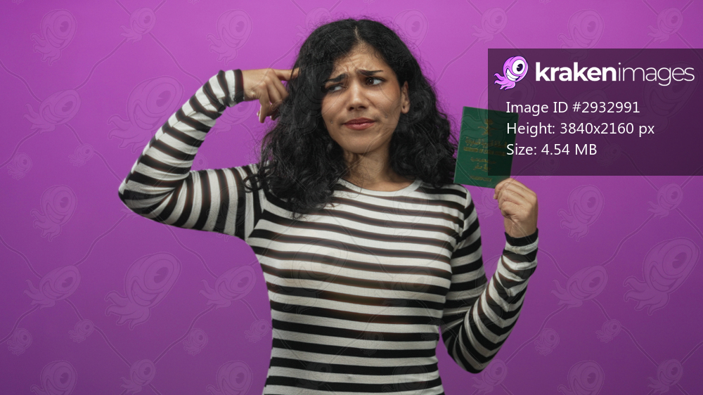 Young arab woman holds saudi passport and points finger to head in purple studio; confusion travel uncertainty.
