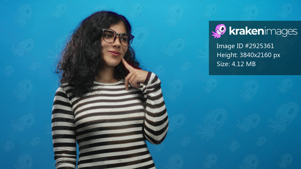 Young arab woman points index fingers to cheeks in bright blue studio wearing black and white striped shirt and oversized glasses; playful curiosity.
