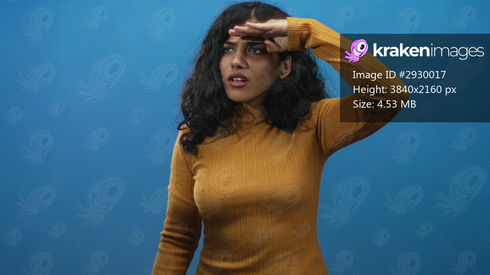 Young arab woman shielding eyes with hand while scanning the distance in a blue studio wearing a mustard sweater and curly hair; curiosity searching.