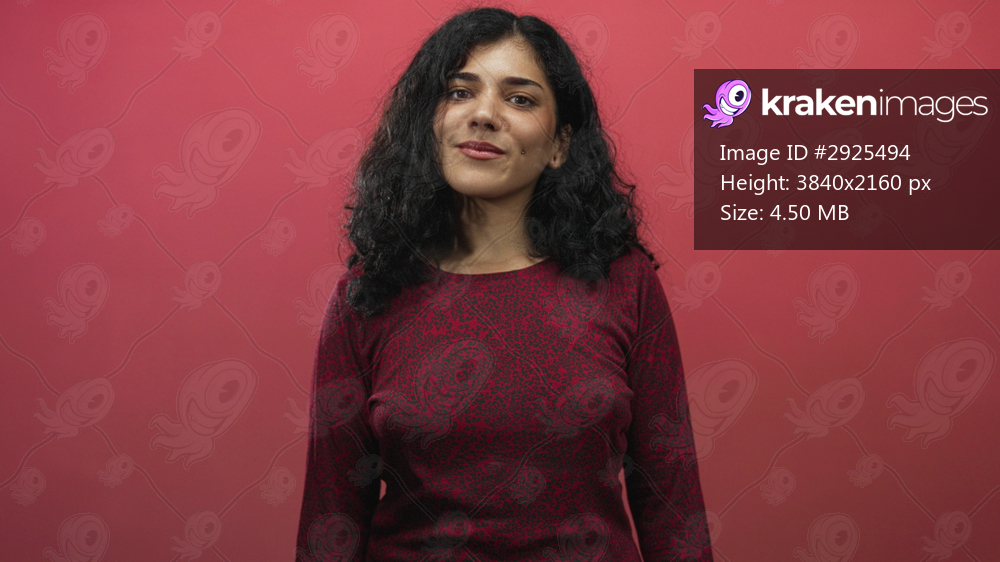 Young arab woman smiling and standing front view, curly brunette hair, wearing a red patterned sweater in a pink studio; confidence identity.