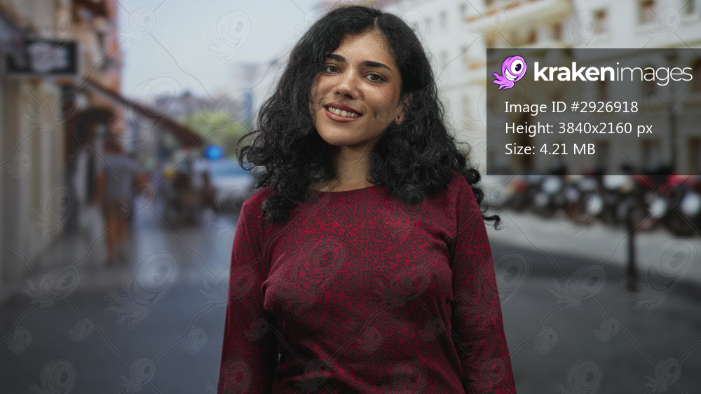 Young arab woman smiling with visible nose piercing on city street in red sweater, face forward; contentment everyday life.