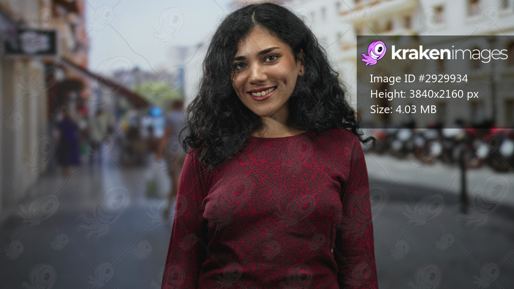 Young arab woman smiling with visible nose piercing on city street in red sweater, face forward; contentment everyday life.