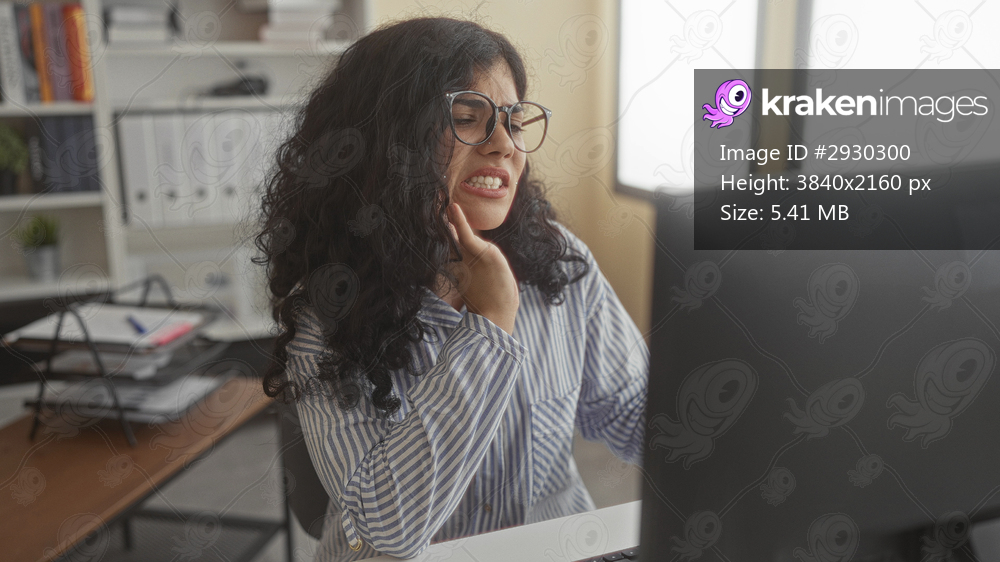 Young arab woman wearing glasses and striped shirt with hand on cheek at office building desk working on a desktop computer with a pained expression; discomfort toothache. - Kraken Images