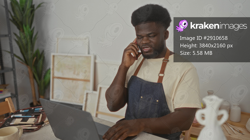 Young artisan man in denim apron holds phone to ear while typing on laptop among pottery tools in a bright studio workspace; concentration.