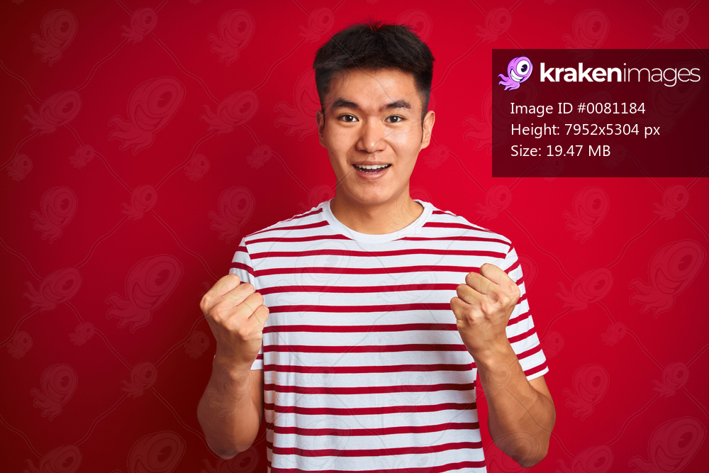 Young asian chinese man wearing striped t-shirt standing over isolated red background celebrating surprised and amazed for success with arms raised and open eyes. Winner concept. - Kraken Images