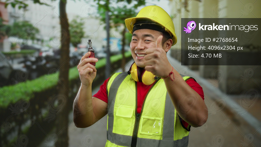 Young asian construction worker in safety gear smiling while holding a vape device on an urban street, highlighting modern lifestyle and city environment. - Kraken Images