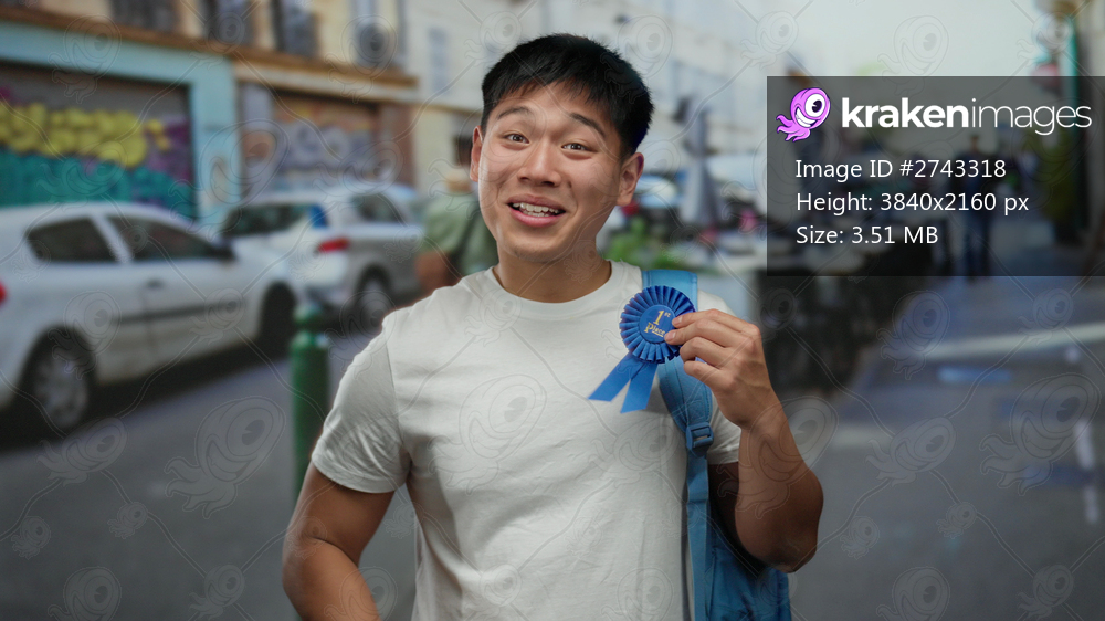 Young asian man holding blue ribbon smiles while standing on a vibrant city street with parked cars and outdoor dining, embodying accomplishment and urban lifestyle. - Kraken Images