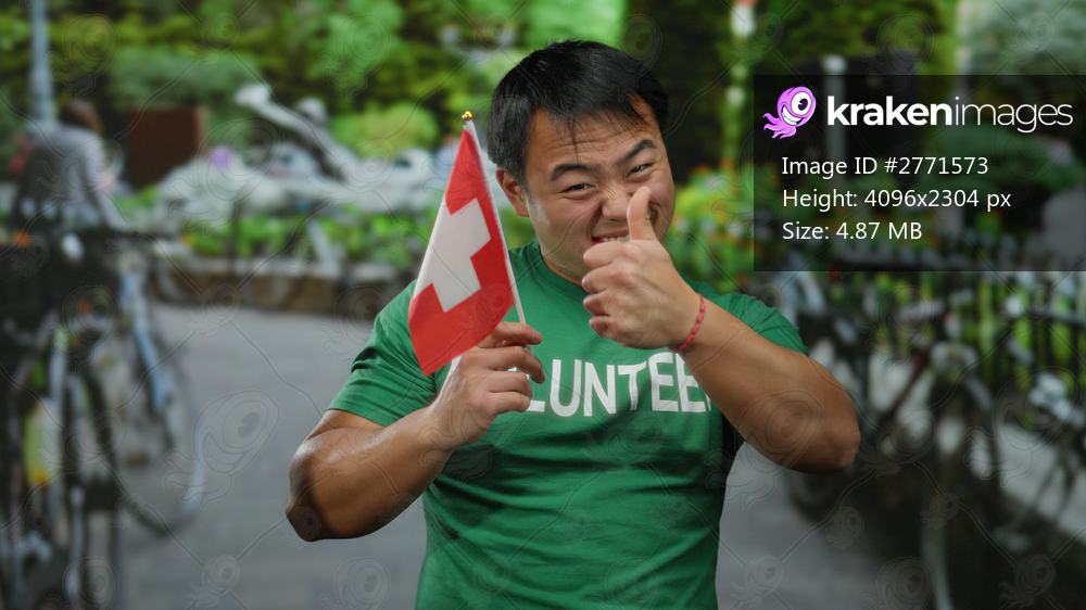 Young asian man holding switzerland flag standing outdoors in urban street showing positive expression in green volunteer shirt