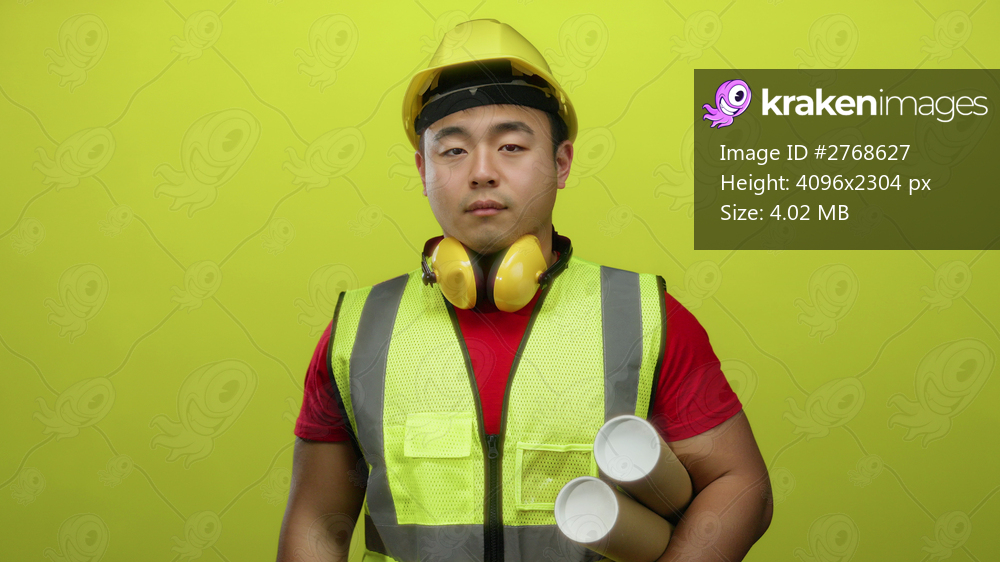 Young asian man in construction gear holding blueprints with yellow background, expressing focus and professionalism in architecture and engineering.
