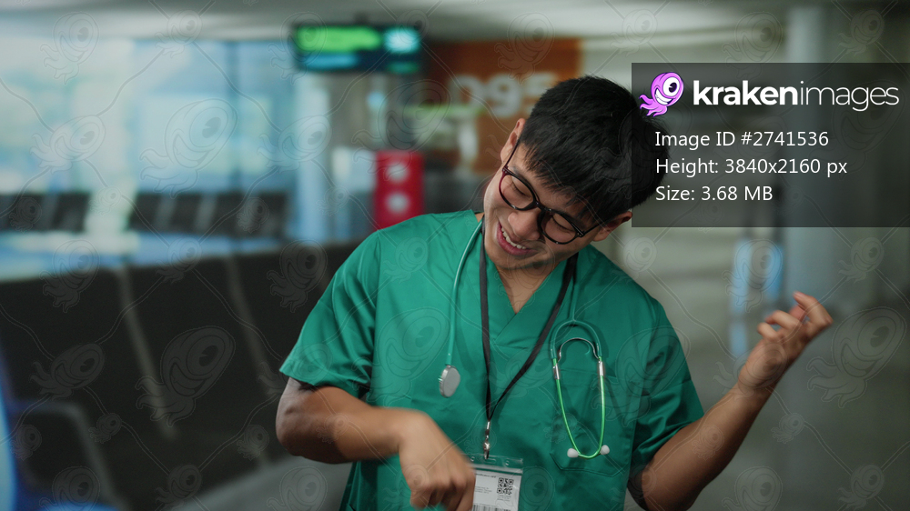 Young asian man in green scrubs playfully mimics guitar playing in an airport terminal, showcasing a friendly and humorous expression in a busy indoor setting. - Kraken Images