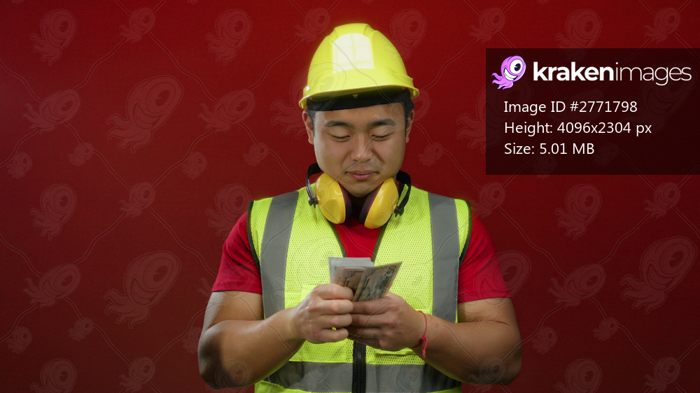 Young asian man in safety vest and hard hat counting us dollars with headphones on red background.