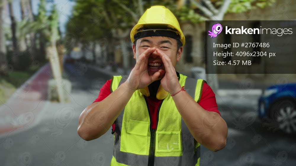 Young asian man wearing safety vest and hard hat shouting in a city street, showcasing urban outdoor construction scene conveying communication energy and engagement amid bustling environment. - Kraken Images