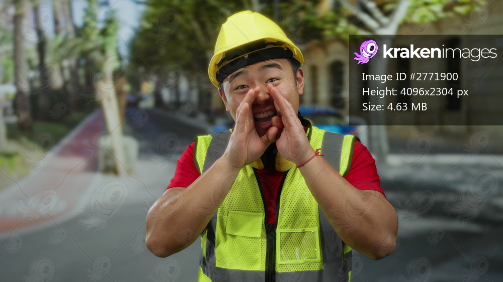 Young asian man wearing safety vest and hard hat shouting in a city street, showcasing urban outdoor construction scene conveying communication energy and engagement amid bustling environment. - Kraken Images