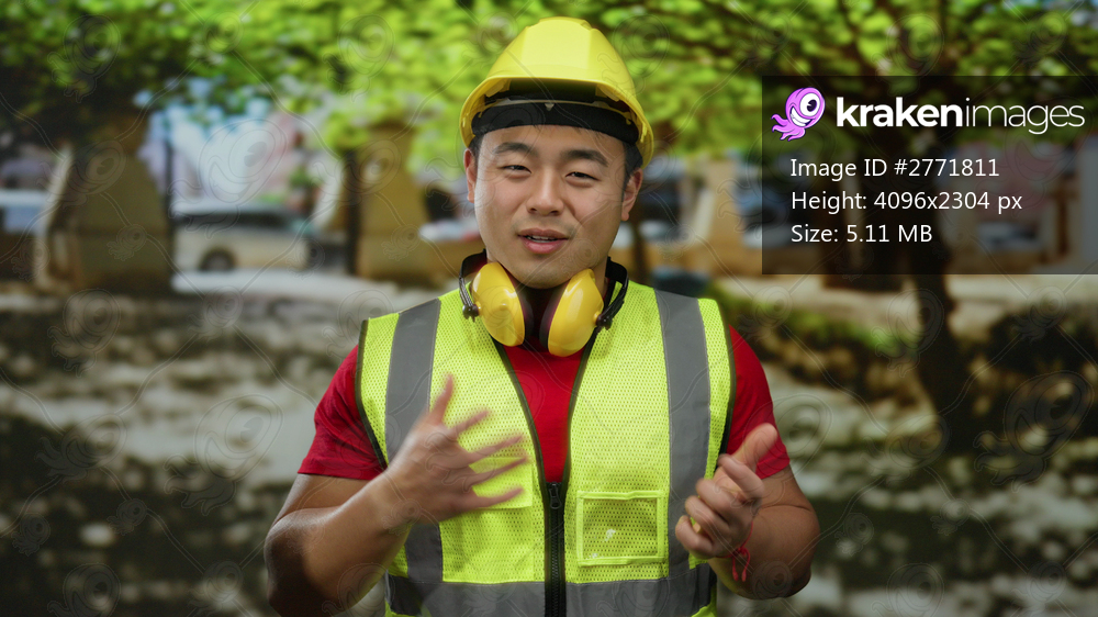 Young asian man wearing safety vest and hard hat smiling confidently outdoors with trees and urban scenery.