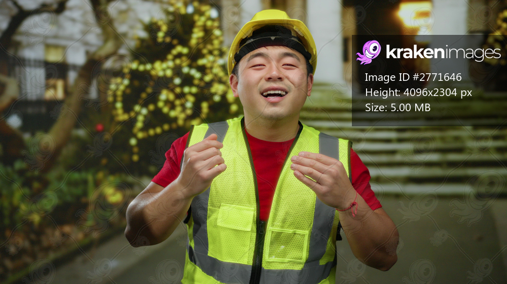 Young asian man wearing safety vest and hard hat stands in festive urban setting with illuminated background, conveying an alert and engaged demeanor.