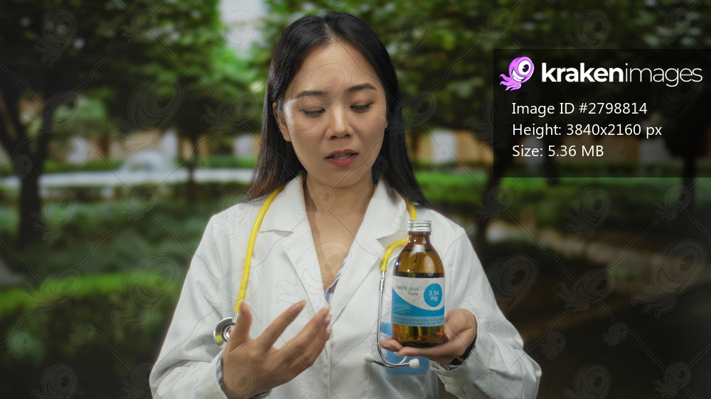 Young asian woman doctor in uniform with stethoscope points at medicine bottle in a lush green park setting.