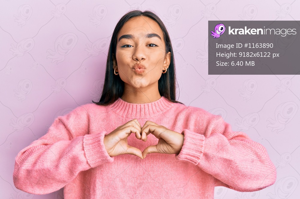 Young asian woman doing heart symbol with hands looking at the camera blowing a kiss being lovely and sexy. love expression.