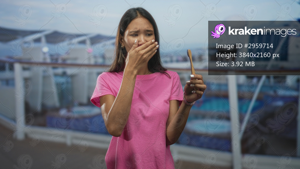 Young asian woman holding a bamboo toothbrush, hand pressed to forehead and covering mouth near building railing on deck by pool, uneasy expression; toothache discomfort. - Kraken Images
