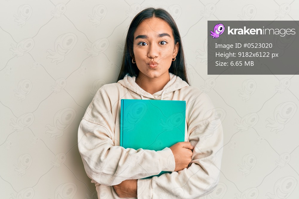 Young asian woman holding book looking at the camera blowing a kiss being lovely and sexy. love expression.